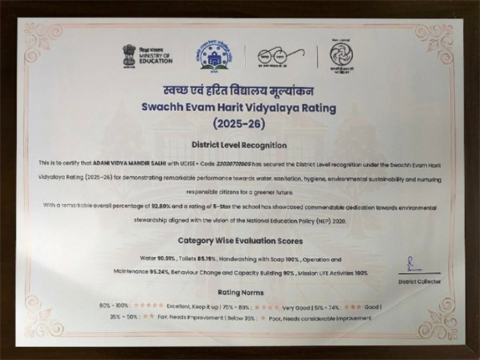 District Recognition for Sustainability,Under the Government of India’s Green & Clean School Initiative, Adani Vidya Mandir Surguja earned a 5-Star Rating after rigorous district inspections and was honoured as the Clean & Green School of Surguja District.